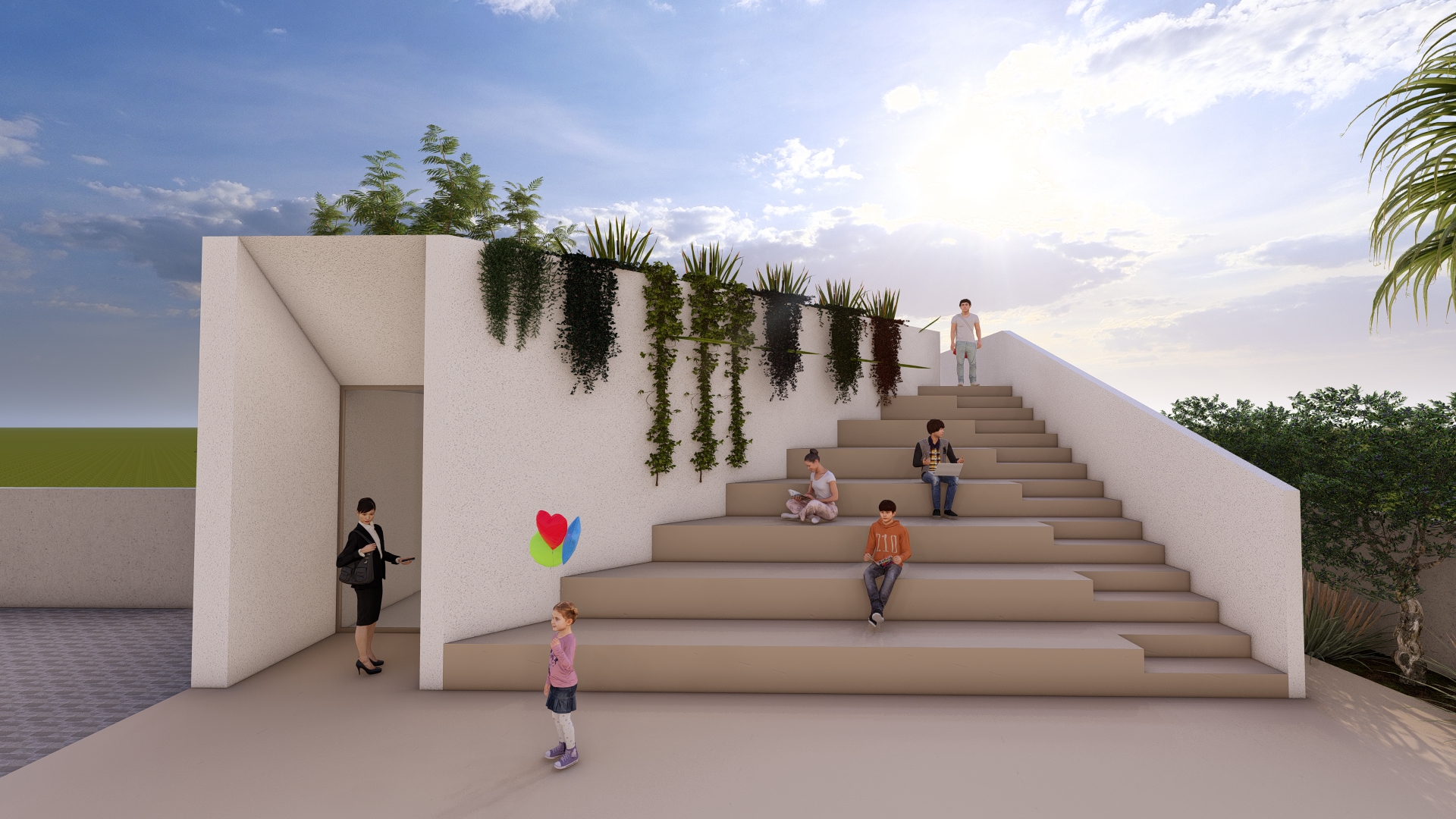 Una scala esterna integrata in una gradonata conduce al terrazzo panoramico, concepito come vero e proprio dispositivo architettonico: un luogo collettivo per attività educative, eventi, spettacoli e momenti di socializzazione, aperto anche al quartiere durante la stagione estiva. Il progetto valorizza significativamente le superfici esterne, combinando aree pavimentate, spazi verdi e terrazzo, con un incremento rispetto allo stato di fatto. Le aree verdi sono arricchite da essenze autoctone e vegetazione rampicante in copertura, che stabiliscono un dialogo diretto tra natura e architettura.